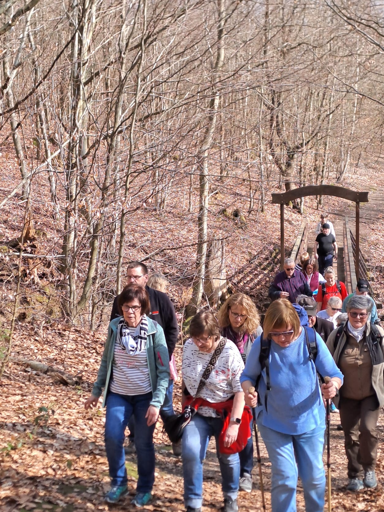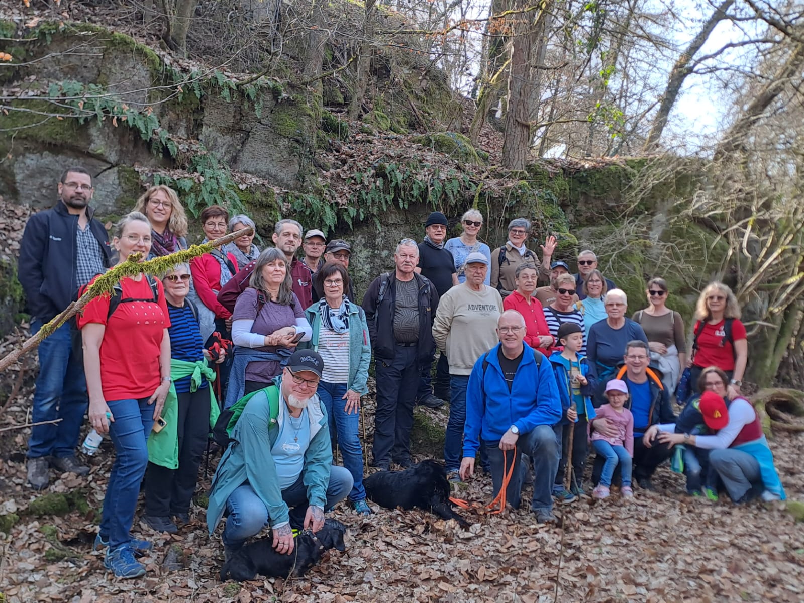 So kann man die heutige Wanderung kurz beschreiben. Aber der Reihe nach – die Wandergruppe mit ca. 30 Personen und 5 Hunden erkundete zunächst die wildromantische Hardtschlucht in Homberg/Ohm. Auf dem naturbelassenen, 1,7 km langen, Rundwanderweg über Brücken und Schluchten gab es immer wieder interessant Details zu entdecken. Nach dem Gruppenfoto und der Teufelssuche ging die Tour weiter vorbei an dem Gestüt Wäldershausen zum Blütenmeer der Märzenbecher auf dem 4 km langen Rundweg in das Naturschutzgebiet Ohmaue/Igelsrain. Das flächenmäßig größte Vorkommen in Hessen bot zahlreiche Fotomotive und Gymnastik inklusive. Danach kehrte die Gruppe zum gemeinsamen Mittagessen im Landgasthof „Hainmühle“ ein. Die gute Küche und der tolle Service sorgten für einen schönen Abschluss der heutigen Wanderung.